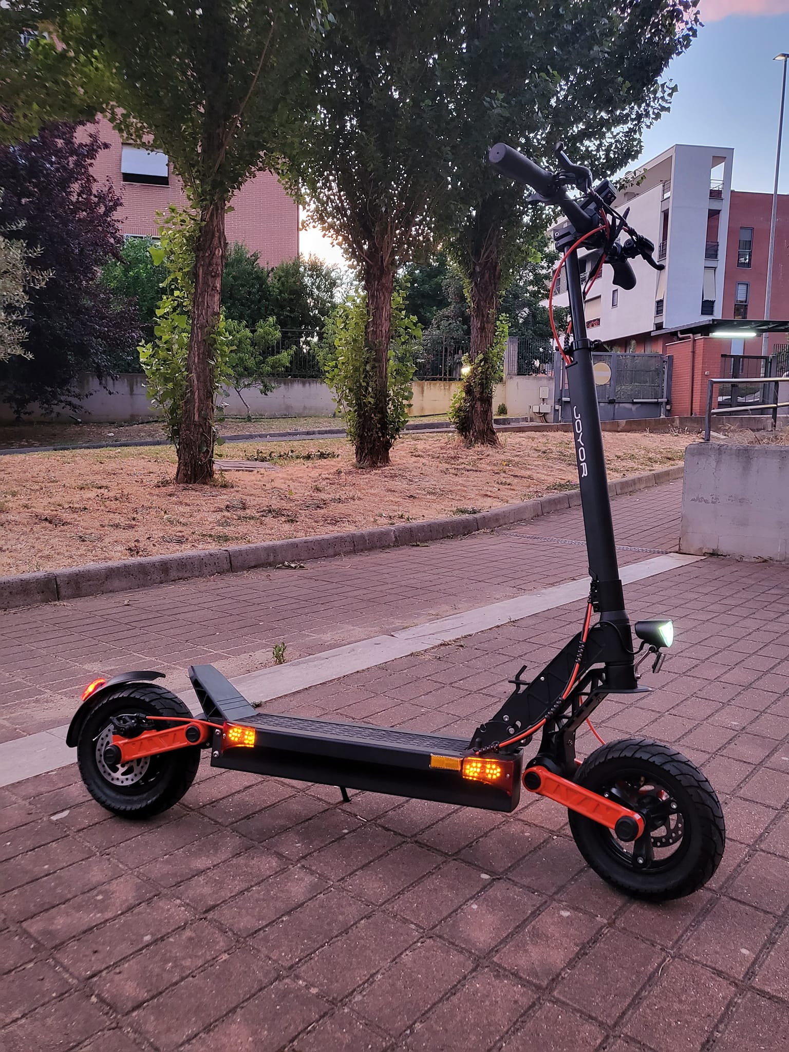 Witness the captivating aesthetics of the Joyor S5 – an aluminum alloy frame adorned with contemporary, graceful contours and a striking orange swingarm. Designed for all-terrain adaptability, this scooter exudes a sense of stability, assuring you of its steadfast companionship on every journey.